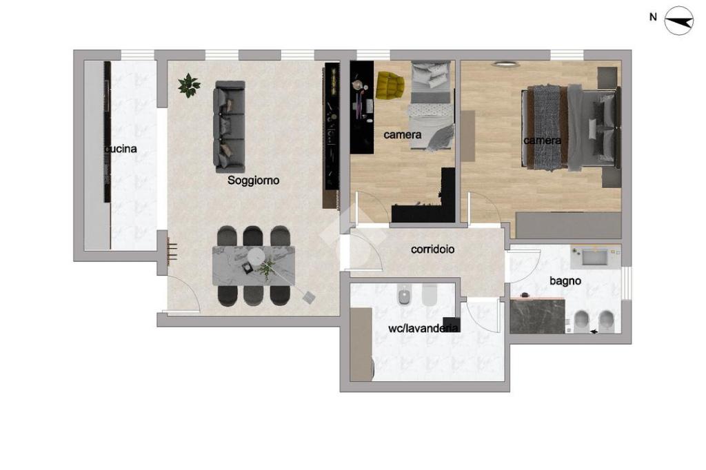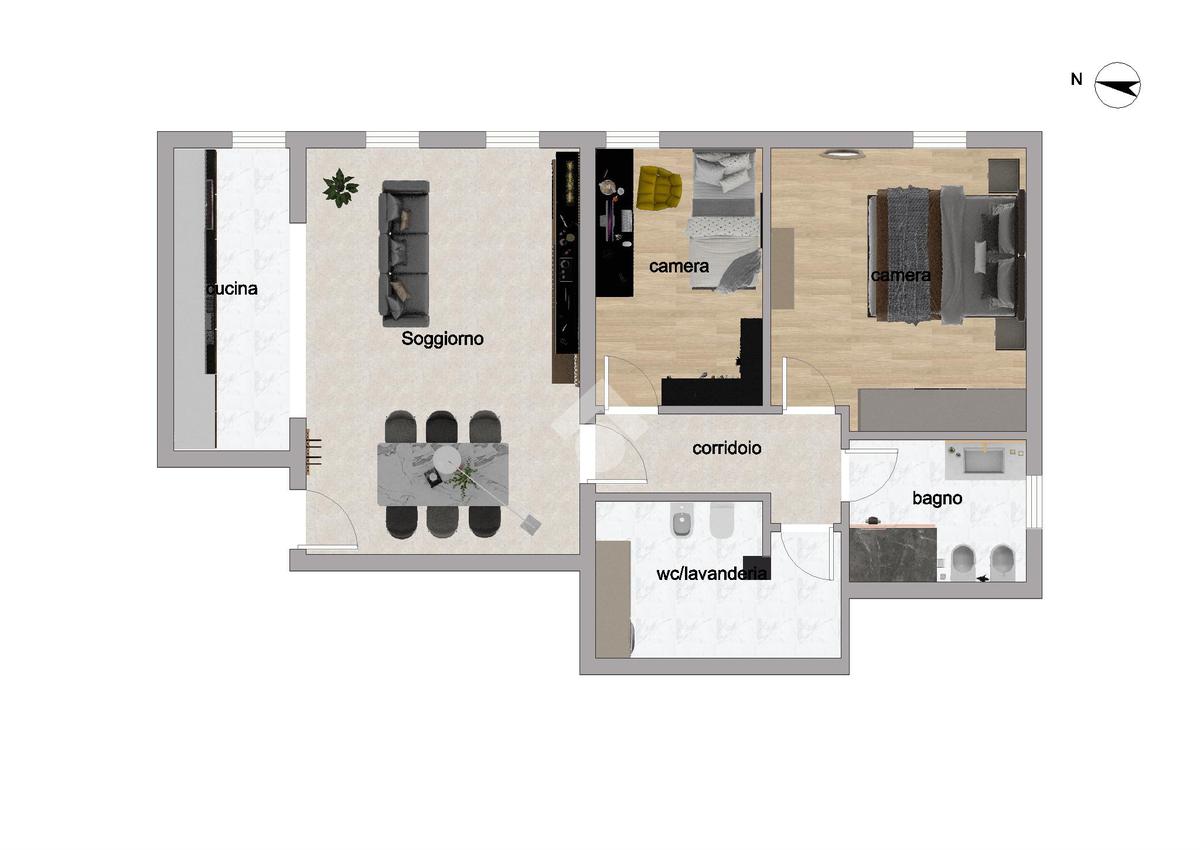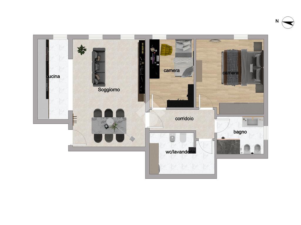 L'immobile ci propone delle caratteristiche uniche nel suo genere, come l'ampia zona giorno di circa 34 mq con cucinotto separato, le due camere di cui la matrimoniale di 16 mq e una singola, i due bagni dei quali uno finestrato e l'atro dotato di zona lavanderia/centrale termica.