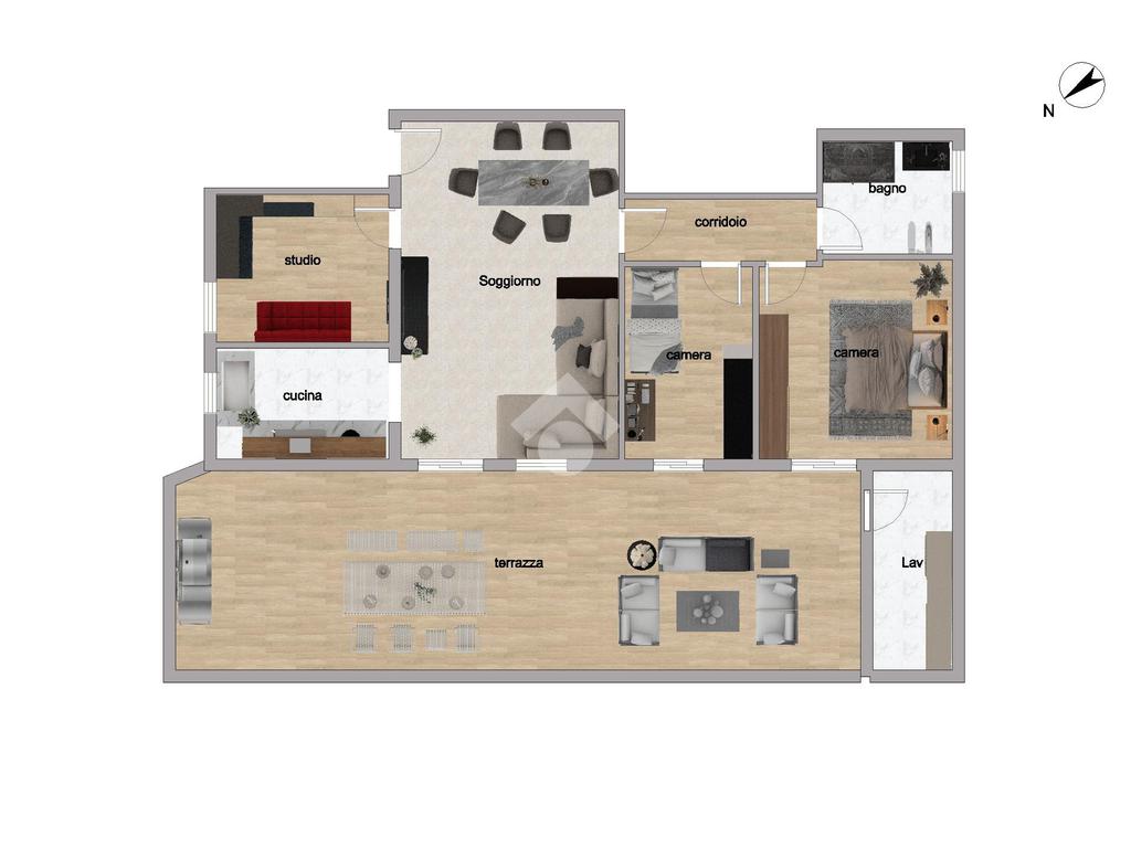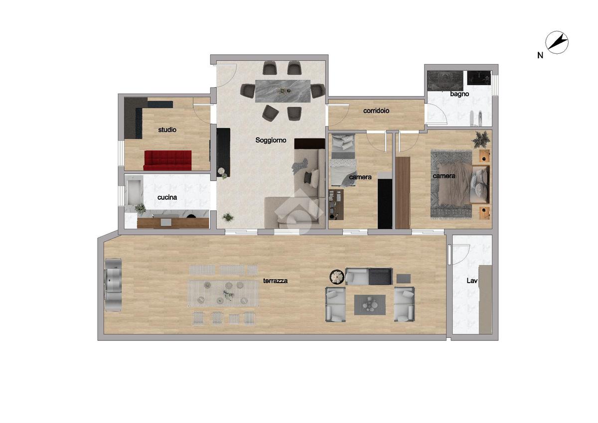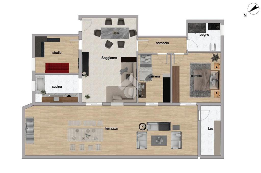 L'immobile ci propone delle caratteristiche uniche nel suo genere, come l'ampia zona giorno di circa 34 mq con cucinotto separato arricchita da un ampio studio che all'occorrenza può diventare terza camera, le due camere di cui la matrimoniale e una singola, il bagno finestrato e infine la vera chicca di questo appartamento, la terrazza abitabile di circa 70 mq con accesso al vano lavanderia/centrale termica.