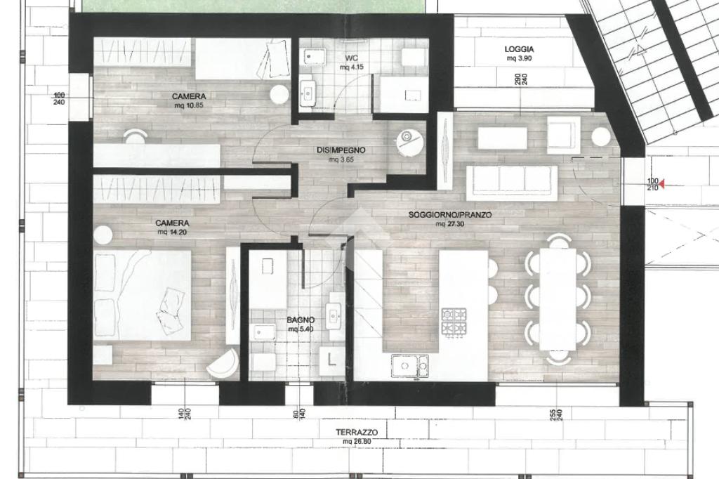 MONASTIER DI TREVISO: in zona centrale nuovo appartamento bicamere con due bagni, terrazzo perimetrale e loggia coperta.
